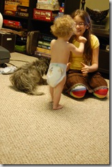 He was pretty pleased with himself, and these photos, while terribly blurry, show him giddily crossing the ocean of floor between myself and Thyra, over and over, honing his new skill.